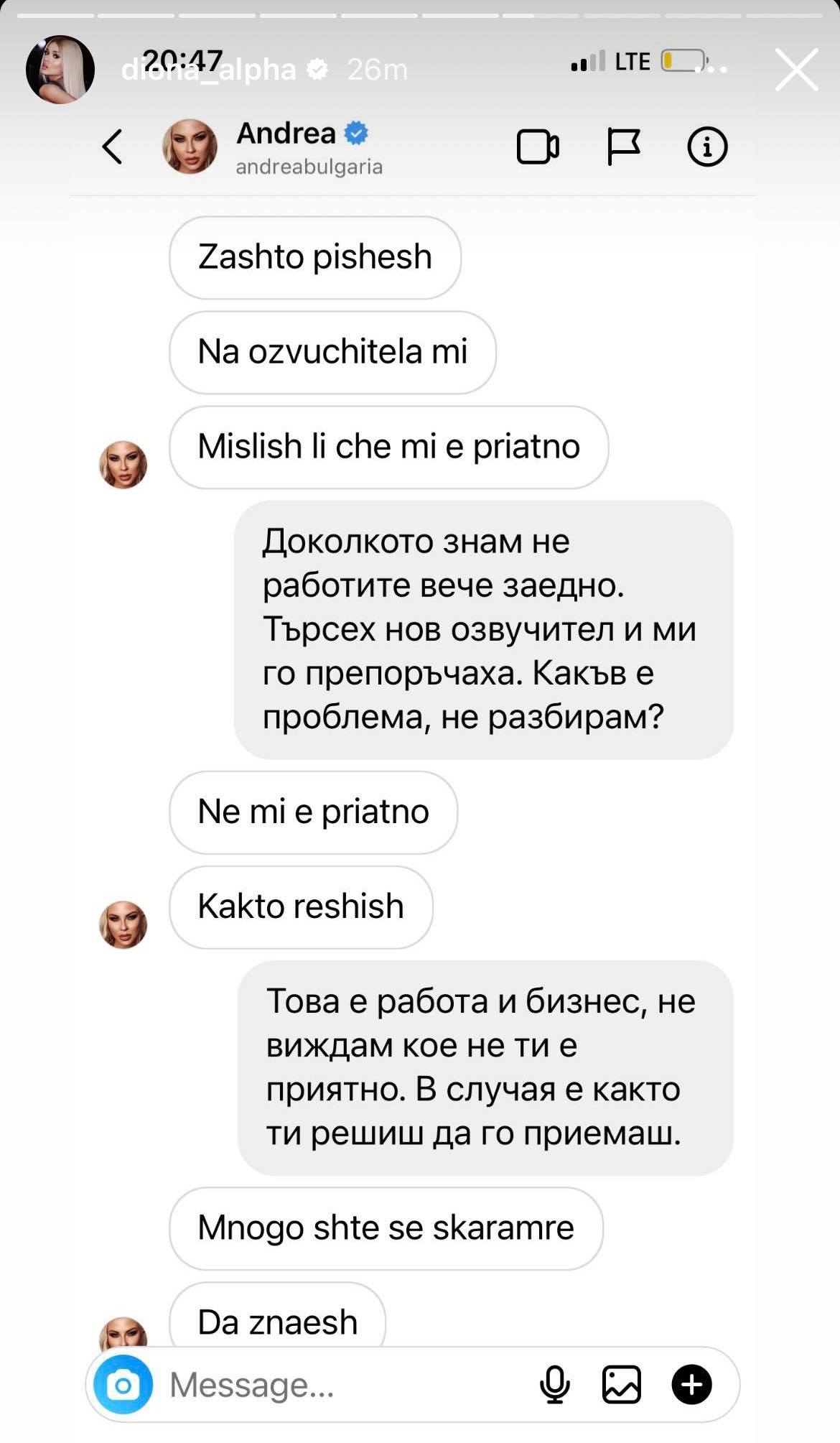 Блондинката веднага написала на колежката си, че не й е приятно да се занимава с нейния озвучител. Диона пък й обяснява, че си търси човек за работа и след като разбрала, че не работят заедно, решила да го покани. Но това не спира Андреа да прекрачи всякакви колегиални отношения и да реши да заплашва Диона. „Следващият път ще ти счупя главата“, заканва й се тя.