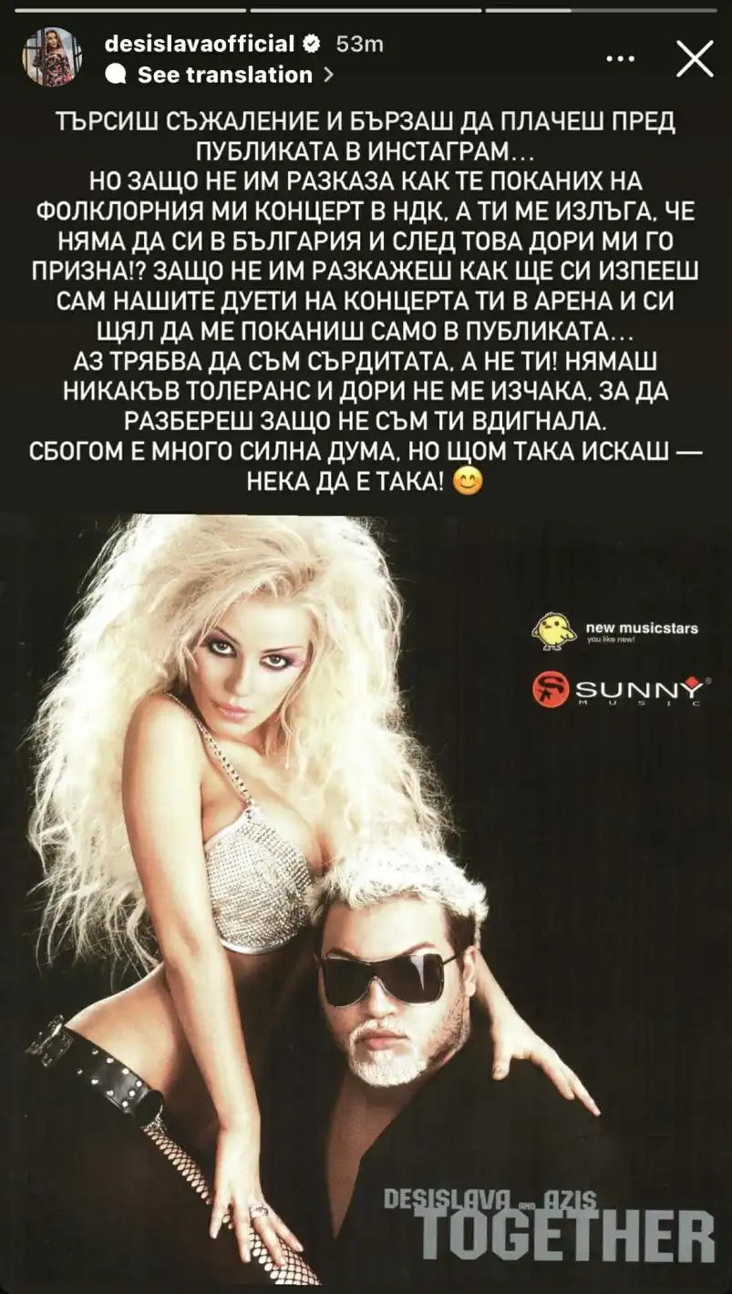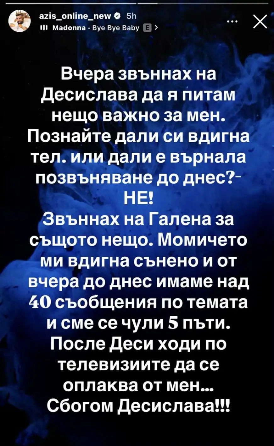 „Вчера звъннах на Десислава да я питам нещо важно за мен. Познайте дали си вдигна веднага телефона или дали е върнала позвъняване до днес? Не!“, разказа Азис, очевидно наранен.
