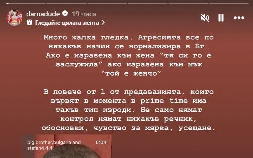 „Много жалка игра. Агресията все по някакъв начин се нормализира в Бг. Ако е изразена към жена-тя си го е заслужила, ако е изразена към мъж-той е женчо. В повечето от 1 от предаванията, който вървят в момента в най-гледаното време, има такъв тип изроди. Не само нямат контрол, нямат никакв речник, обноски, чувство за мярка, усещане“, съвсем правилно е възмутена Дара.