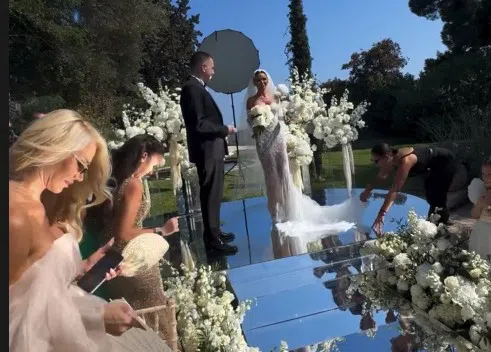 Вилата, избрана за купона разполага с голям басейн, около който бяха наредени масите на празнуващите. В него пък се потопи ансамбъл по синхронно плуване, за да ги забавлява. Не липсваше и балет на дансинга. Логично украсата бе от бели цветя и свещи. Гостите се пазеха от жаркото слънце със специални бели чадъри, в бяла дантелена рокля бе и булката. Косата й бе покрита с воал. До своеобразния олтар я заведе единствената й наследница Марая.