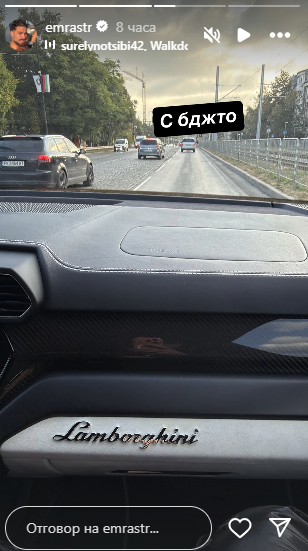 „Видях го с очите си как шофираше по бул. „Цар Борис III“, след това беше качил клипче как си мие колата на автомивка за самообслужване и видимо беше сам. По-късно явно се усети и изтри видеото. За да замаже положението, преди часове Емрах е качил как се вози в „Ламборгини“ и написал подигравателно „С бджто“, визирайки, че е с влак.