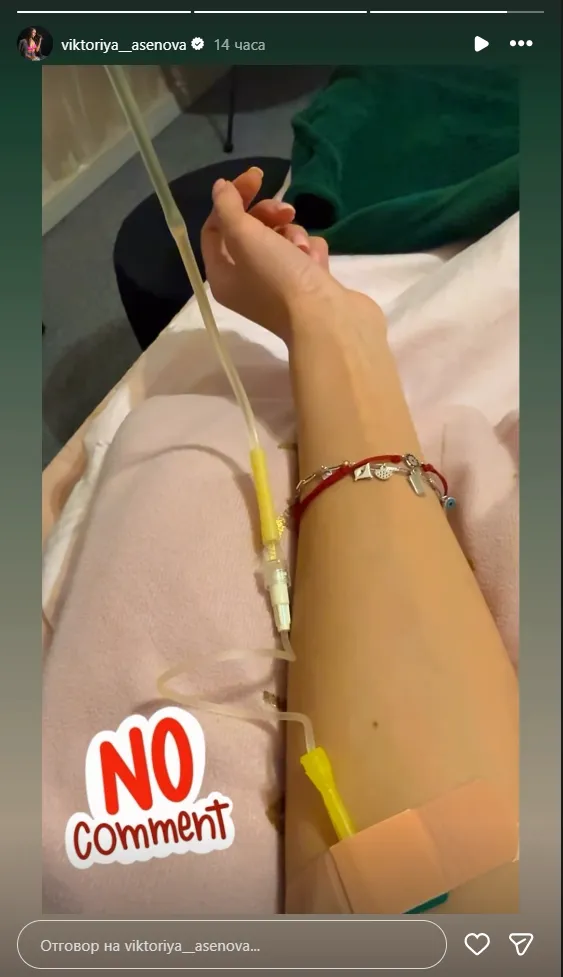 Красавицата сподели снимка, на която се вижда ръката ѝ с поставен абокат и включена система. Към кадъра тя добави само краткия надпис: „Без коментар“.