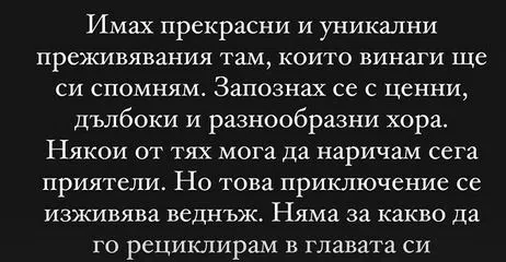„Имах прекрасни и уникални преживявания там, които винаги ще си спомням. Запознах се с ценни, дълбоки и разнообразни хора. Някой от тях мога да наричам сега приятели, но това приключение се изживява веднъж. Няма за какво да го рециклирам в главата си“, заяви той.