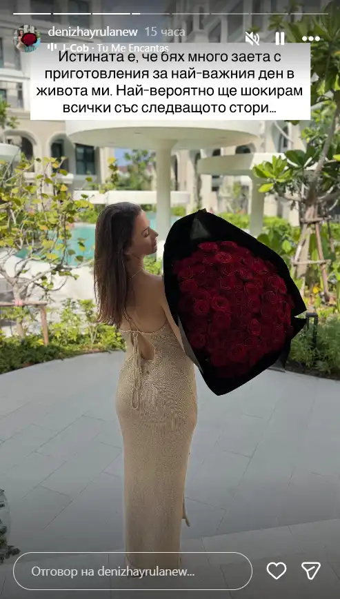 „Сигурна съм, че това, което ще ви издам, ще ви шокира, но тепърва следете сторитата ми… Засега ще кажа само, че тези дни бях страшно заета с подготовката на най-щастливия ми ден“, написа тя, предизвиквайки голямо любопитство в мрежата.