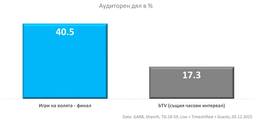 Финалът на екстремния риалити формат „Игри на волята“ бе безапелационен лидер в телевизионния ефир в петък вечер. Битката за голямата победа и наградата от 100 000 лв. на Арената в Дивия север привлече над 40% от всички зрители в активна възраст (18-59 г.). Втората телевизия по това време е с над 2 пъти по-нисък резултат, с отчетен 17.3% аудиторен дял по същото време.