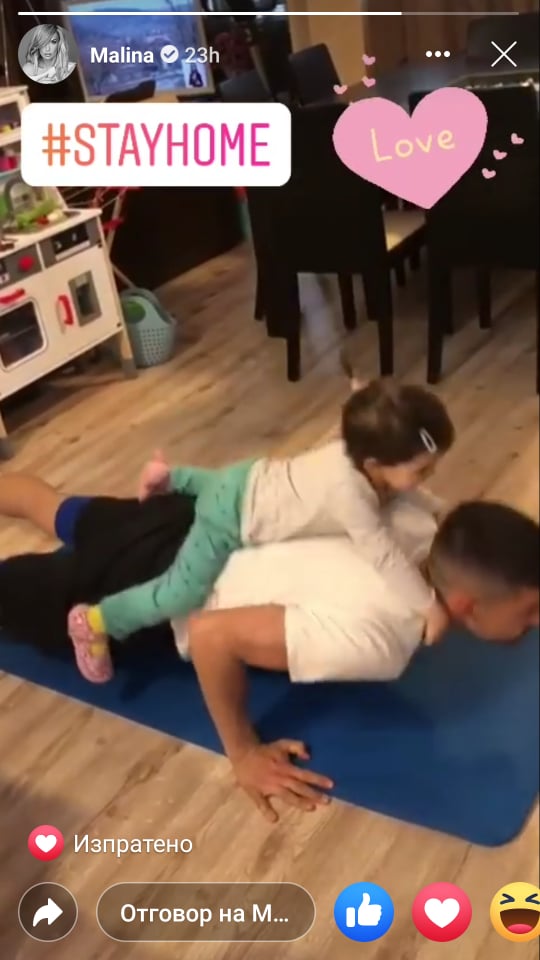 Малина никога до този момент не е коментирала темата, нито пък беше споледеляла снимки на внучето. Тези дни реши да го направи и на стори в Инстаграм качи видео, на което синът й прави лицеви опори, а на гърба му е малката Малина.