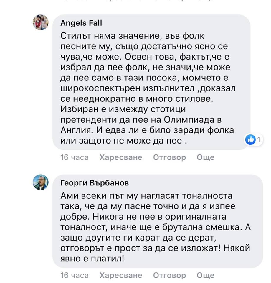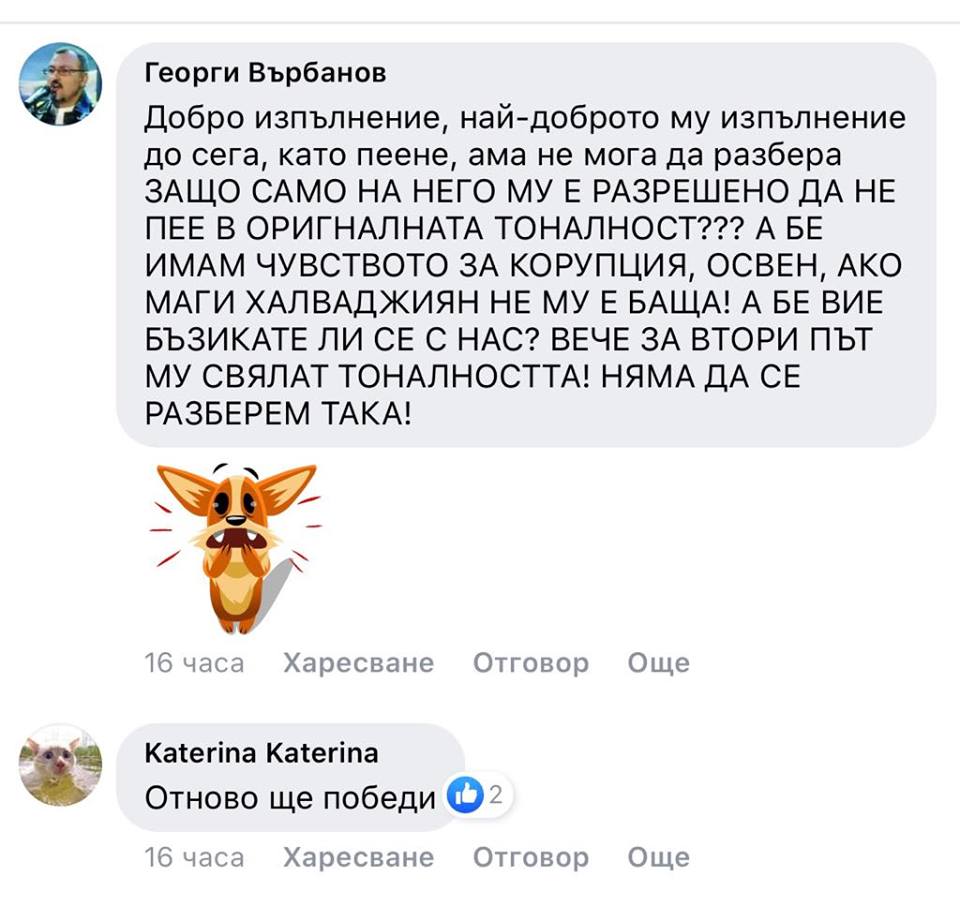 „Добро изпълнение, най-доброто му изпълнение до сега, като пеене, ама не мога да разбера ЗАЩО САМО НА НЕГО МУ Е РАЗРЕШЕНО ДА НЕ ПЕЕ В ОРИГИНАЛНАТА ТОНАЛНОСТ??? А БЕ ИМАМ ЧУВСТВОТО ЗА КОРУПЦИЯ, ОСВЕН, АКО МАГИ ХАЛВАДЖИЯН НЕ МУ Е БАЩА! А БЕ ВИЕ БЪЗИКАТЕ ЛИ СЕ С НАС? ВЕЧЕ ЗА ВТОРИ ПЪТ МУ СВАЛЯТ ТОНАЛНОСТТА! НЯМА ДА СЕ РАЗБЕРЕМ ТАКА!“, кипна Георги Върбанов. Според когото „някой явно е платил“ за комфорта на младия Стораро.