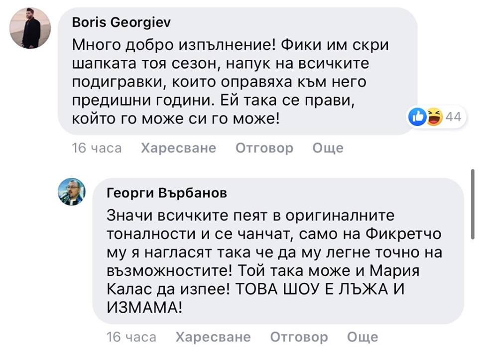 „Значи всичките пеят в оригиналните тоналности и се чанчат, само на Фикретчо му я нагласят така, че да му легне точно на възможностите! Той така може и Мария Калас да изпее! ТОВА ШОУ Е ЛЪЖА И ИЗМАМА!“, нададе вик музикантът след снощния лайф.