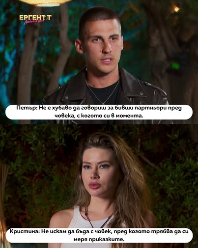 Междувременно актьорът Петър се обиди на юристката Кристина, която коментира предишните си връзки пред него и останалите риалити герои. „Криси се притеснява да проявяваме близост, но не се притеснява да говори за бившите си. На кой мъж му е приятно да слуша за един, за втори, за трети…“, огорчено каза той. Според Петър, юристката го злепоставя с истории от миналото си.Криси обаче не разбира как е възможно миналото ѝ да засяга чувствата му и твърди, че няма нищо против да знае детейли за неговото. „Петър на моменти не може да се владее, дребни неща го изнервят. А аз не искам да бъда с някой, с когото да си меря думите и да се притеснявам, че най-малкото нещо може да го обиди“, каза тя, а от очите ѝ бликнаха сълзи.