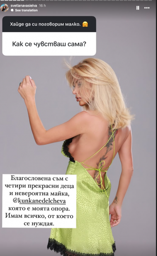 От стори в Инстаграм профила си Светлана допълни, че се чувства добре след раздялата, благодарение на майка си и четирите си деца. „Имам всичко, от което се нуждая“, доволна е бившата Гущерова.