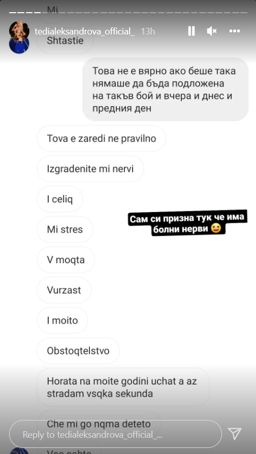 Теди Александрова публикува скрийшове на чатове с Емрах, от които става ясно, че той системно й е посягал. „Не се притеснявай, няма да кажа на лекарите и на полицията, че ти ми счупи носа.