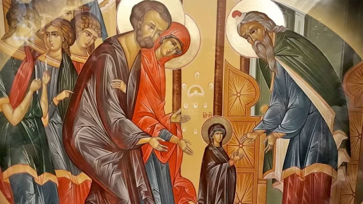 Според църковното предание праведните Йоаким и Анна, дълго бездетни, измолили от Бога дете и обещали да го посветят на служение. Когато Мария навършила три години, те я отвели тържествено в Йерусалимския храм. Първосвещеник Захария – ведом от Светия Дух – въвел Младенеца не само в храма, но и в Светая Светих, където единствено първосвещеникът имал право да влиза веднъж годишно. Това подчертава избора на Мария за бъдеща Майка на Спасителя.