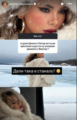 Днес обаче Кристина за първи път си позволи коментар по темата, разкрива Intrigi.bg. Попитана как ще коментира общата й снимка от колата на Виктор, юристката отговаря: „Че двама приятели се прибират от рождения ден на Габи“. На въпроса дали всъщност Криси и Виктор не са се събрали за утеха след разочарование от Дениз и Петър, блондинката отговаря: „Дали е станало така?“.