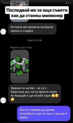 Любопитно е, че Виктор също пусна коментар по темата. Той публикува скрийншот от разговор със свой последовател, който му разкрива как се е хванал на бас, че двамата с Криси са заедно. „Ако не си с нея, братле, моля те, хващай я, че ще загубя пари“, пише му фенът. „Ако се навиеш да цепим печалбата – и да не съм с нея, ще я хвана“, гласи отговорът на Криси, пише Intrigi.bg.